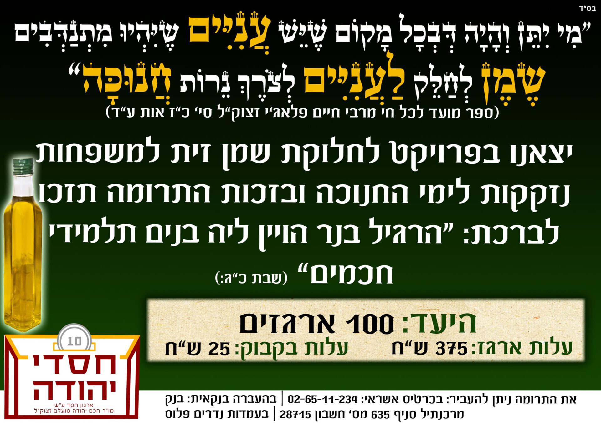 חלוקת בקבוקי שמן זית לאברכים ומשפחות נזקקות חנוכה